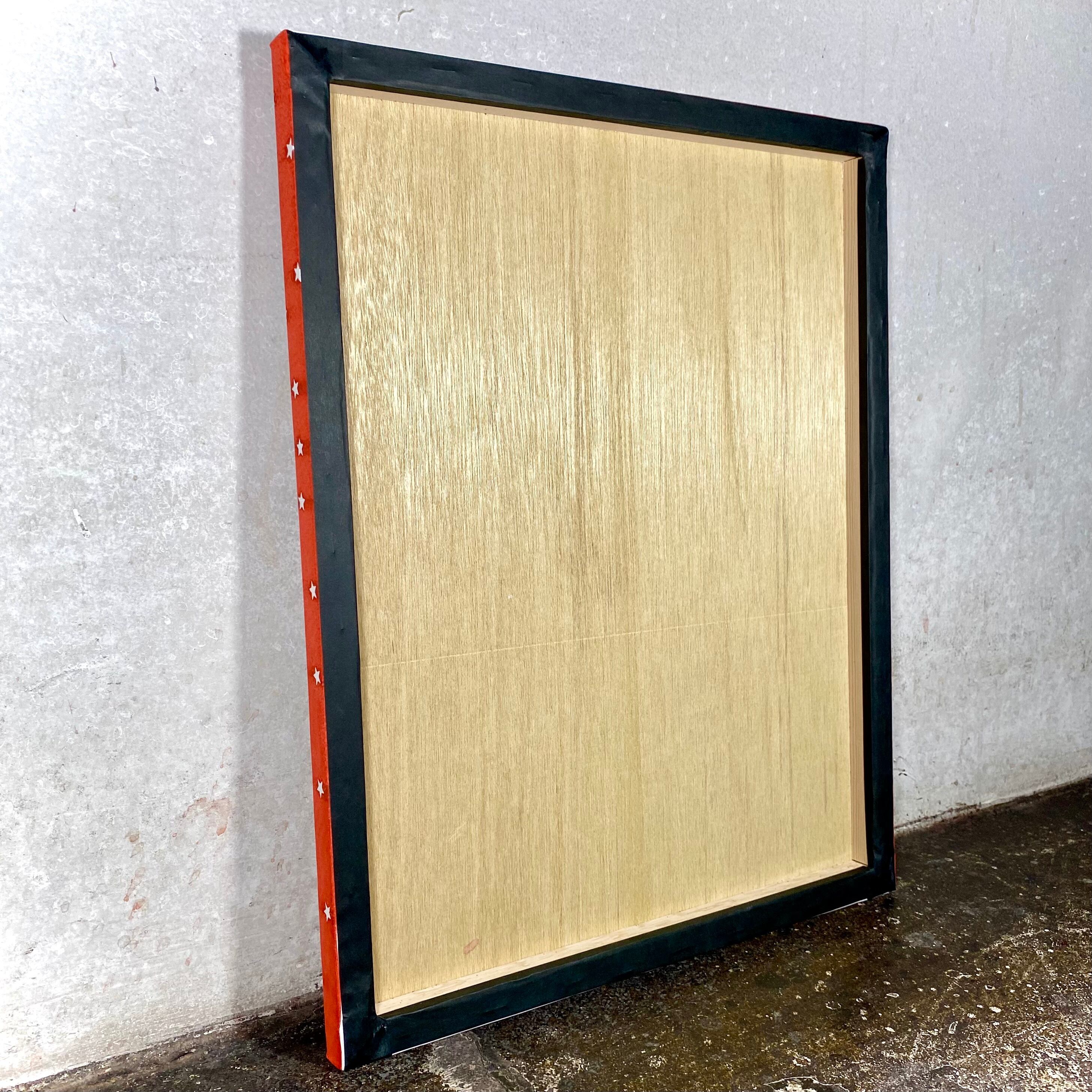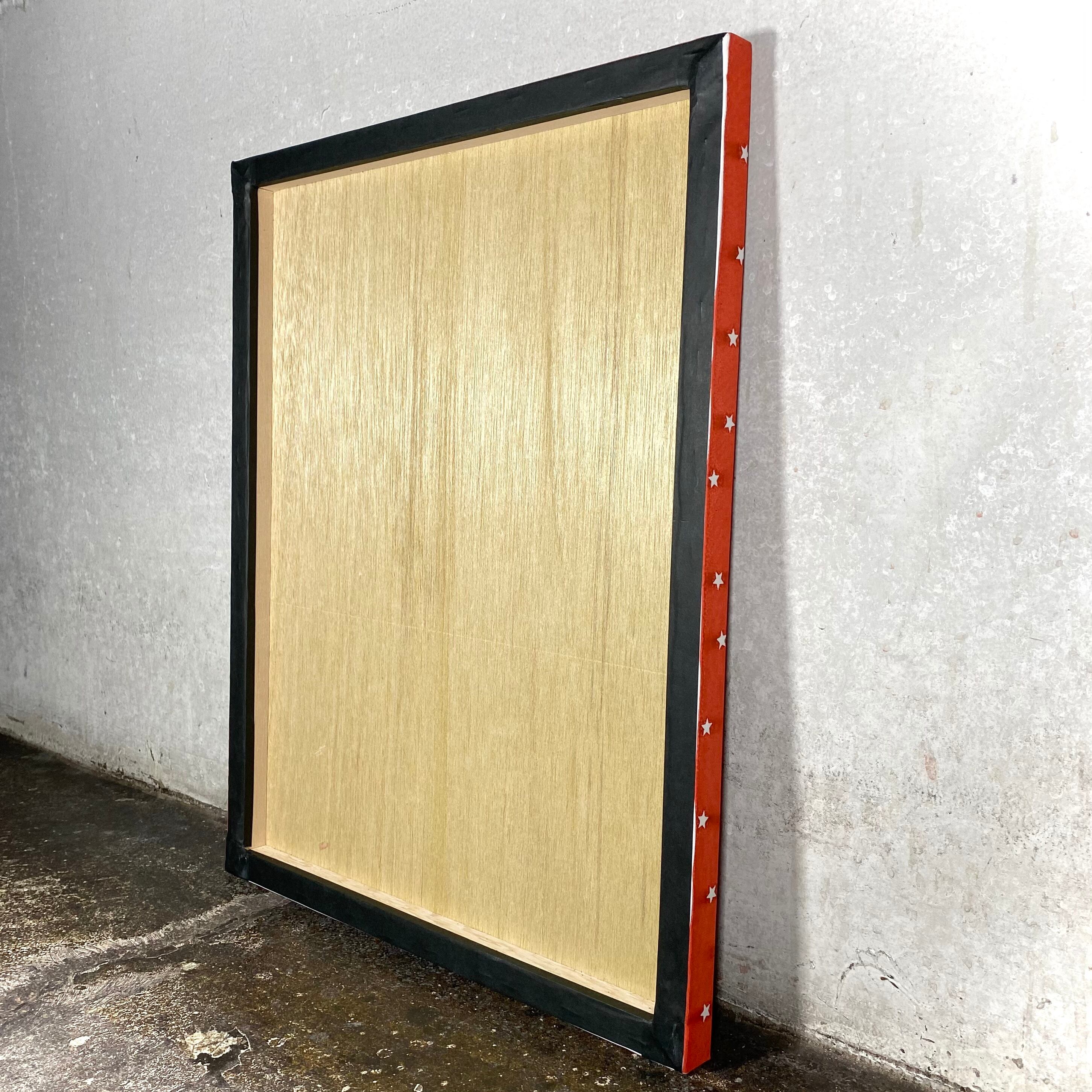 染めた布を木材パネルにパネル張りをし、裏側の布は見えないようテープで処理しております。