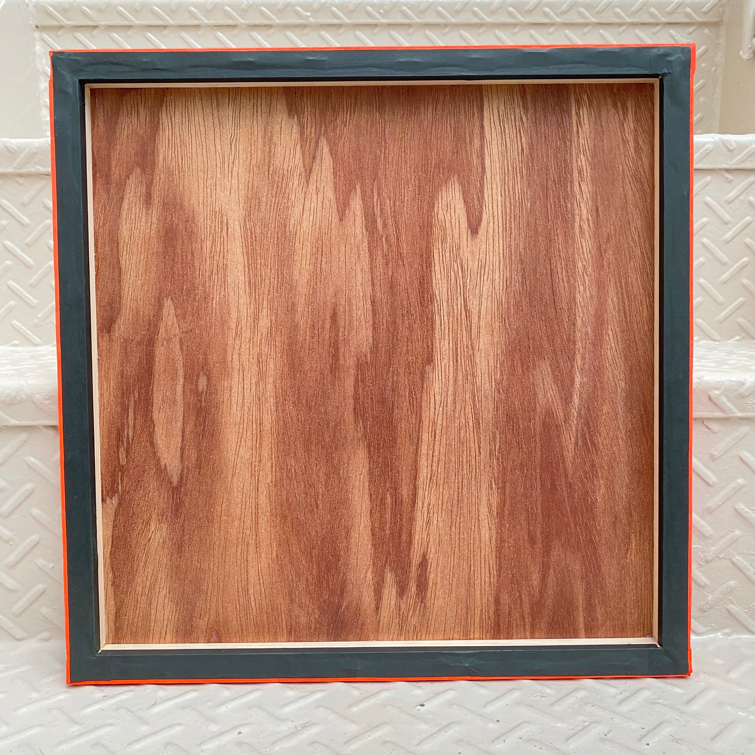 染めた布を木材パネルにパネル張りをし、裏側の布は見えないようテープで処理しております。